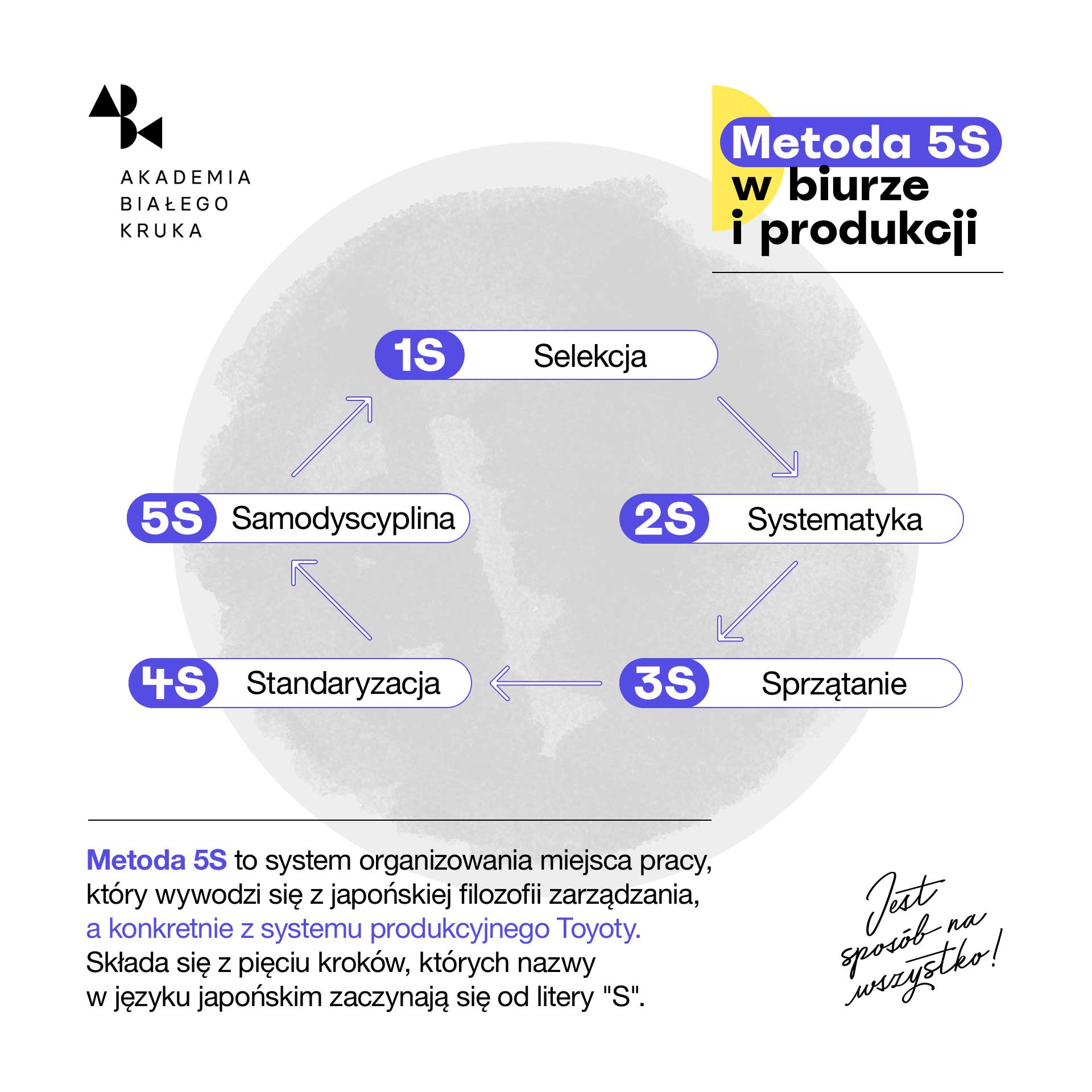 Metoda 5S to system organizowania miejsca pracy, który wywodzi się z japońskiej filozofii zarządzania, a konkretnie z systemu produkcyjnego Toyoty. Składa się z pięciu kroków, których nazwy w języku japońskim zaczynają się od litery „S”: